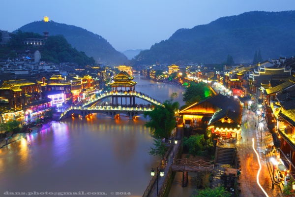 Phượng Hoàng cổ trấn được xây dựng từ năm 686 dưới thời nhà Đường, là trung tâm văn hóa, chính trị và quân sự của cả vung thời Minh – Thanh. Ngày nay, cổ trấn này dường như còn “ngái ngủ” sau 1.300 năm. Những hàng mái ngói âm dương chập chùng, uốn khúc, tưởng chừng như vô tận, bao phủ những căn nhà gỗ chênh vênh trên hàng cọc cao men theo dòng Đà Giang trong xanh. Khi màn đêm buông xuống, cảnh sắc của Phượng Hoàng cổ trấn càng thêm lung linh huyền ảo như trong một bức tranh nhiều màu sắc, như một con Phượng Hoàng lửa đang tắm mình trên dòng Đà Giang nên thơ và tĩnh lặng. Dãy đèn lồng trước hiên những ngôi nhà cổ soi bóng xuống làm rực sáng cả khúc sông.
